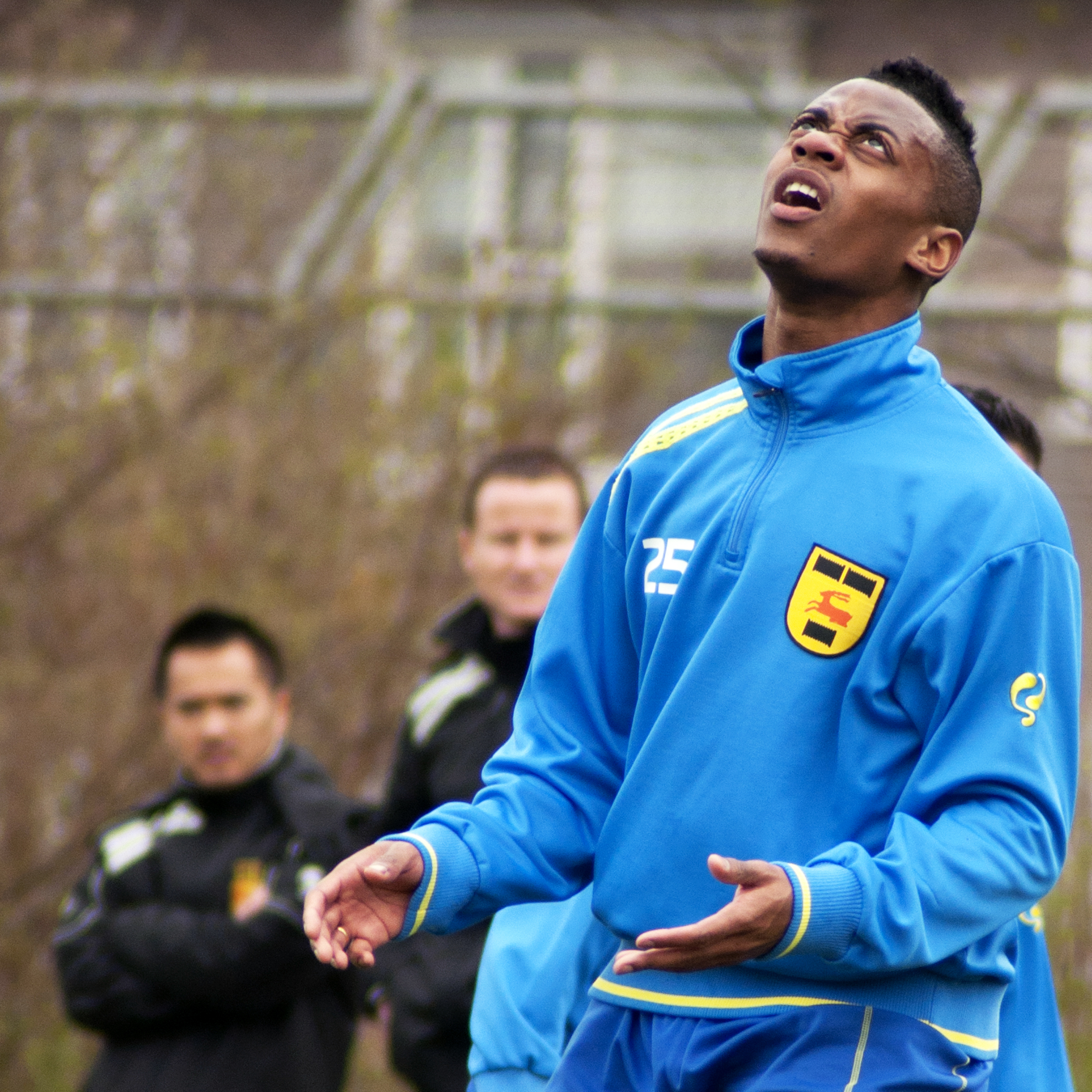 De wedstrijd is ten einde en wij zitten met een paar fotografen te wachten tot de spelers hetzij teleurgesteld hetzij de overwinning vierend, het veld aflopen.